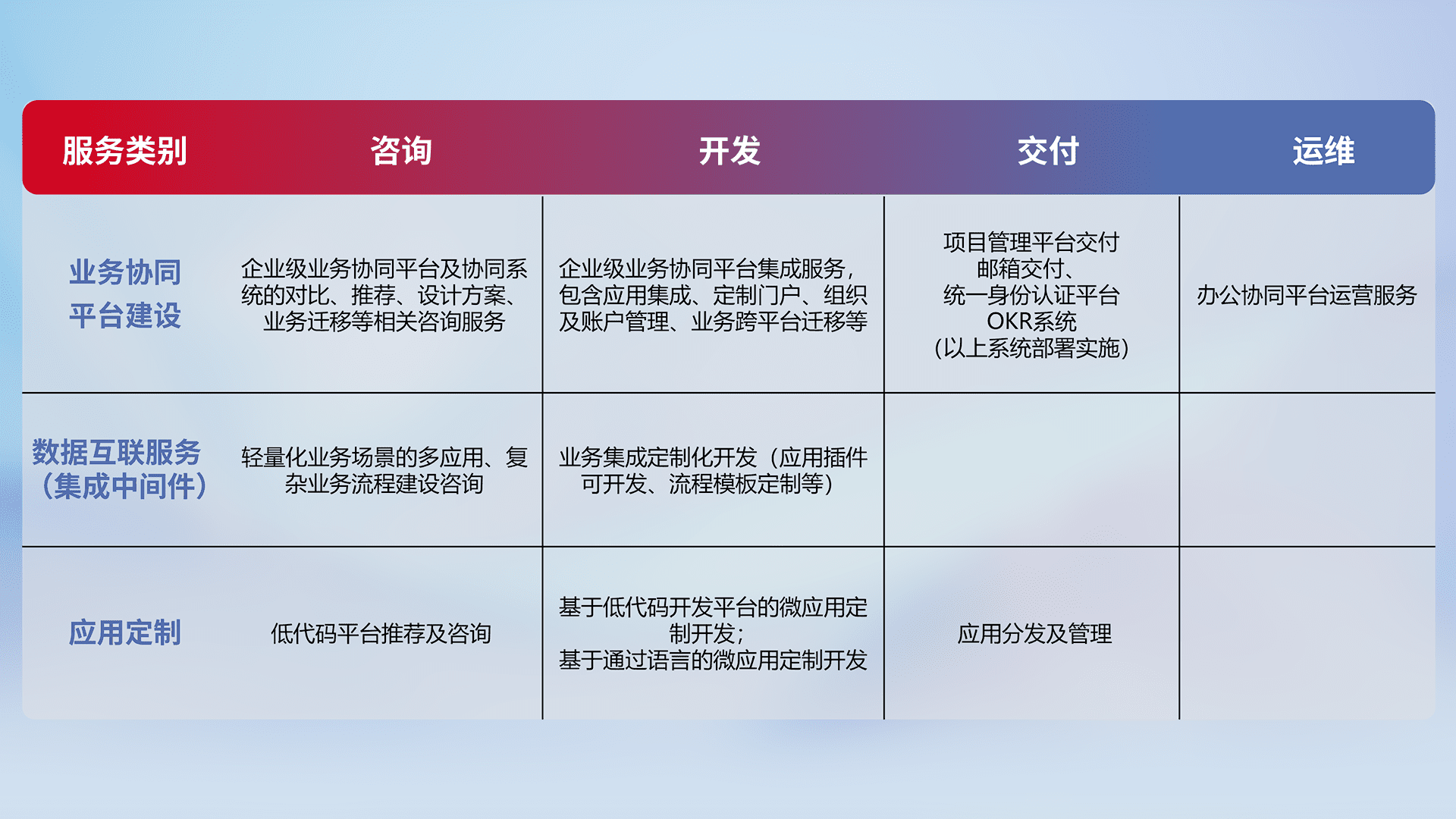 针对钉钉、、企微、、、、IDaas等平台级产品提供产品的规划、、方案、、、交付、、、定制化开发等服务,,,,实现如统一协同办公、、、、智能客户服务、、、、混合会议管理、、智能数据查询、、、、等业务场景,,,实现数字化转型。。。